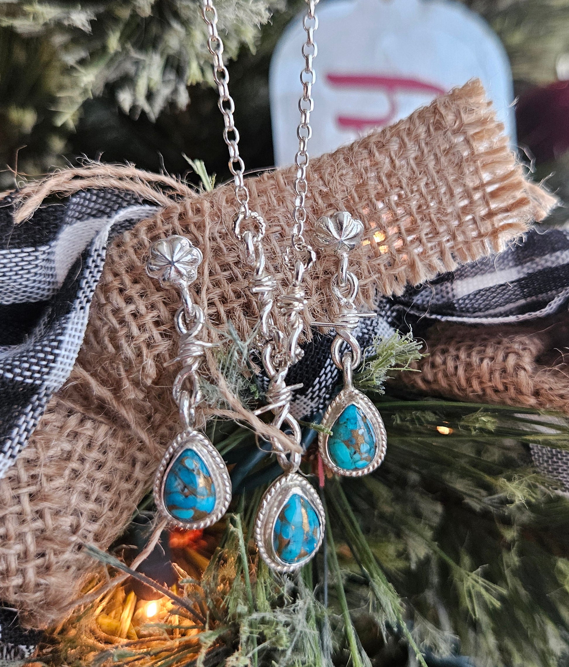 The “Denim Dahlia” set features rich blue Kingman composite turquoise, selected for its deep denim tones and natural veining. Each stone is set in solid .925 sterling silver and accented with handcrafted barbed wire details, adding a bold Western edge to this one-of-a-kind set.