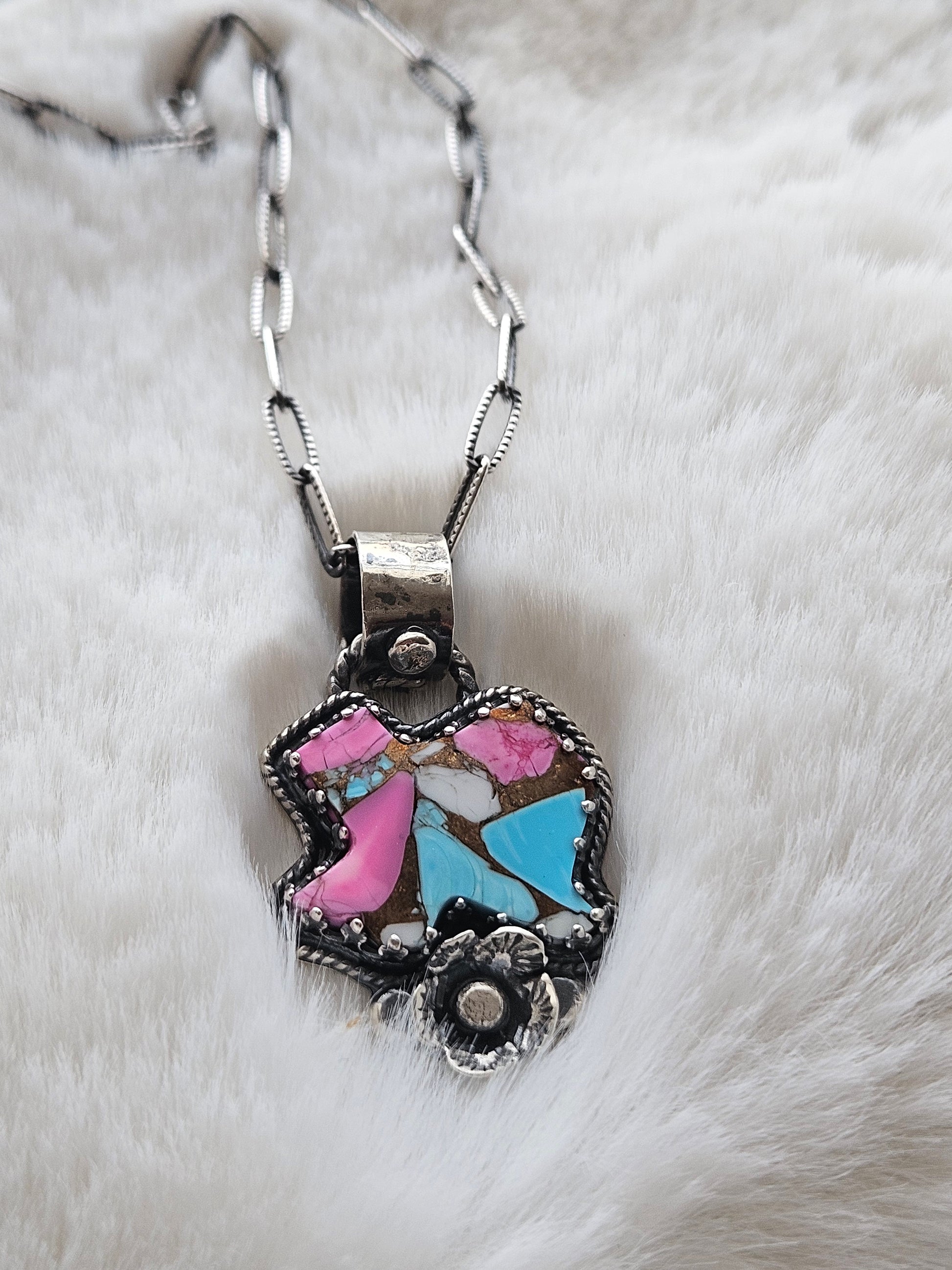 This one-of-a-kind Texas pendant is completely handcrafted in solid .925 sterling silver and features a vibrant cotton candy composite stone set by hand. Each stone is individually placed, creating a bold, unique pattern that can never be replicated.